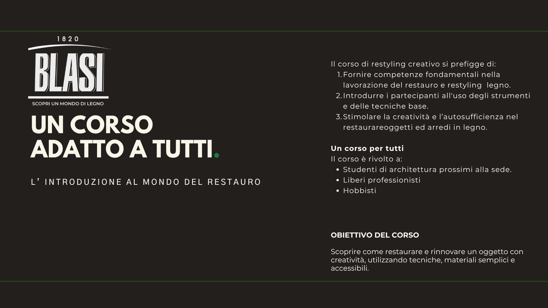La Blasi Legnami è lieta di annunciare l’organizzazione di un corso di restauro base presso la propria sede. Il corso sarà tenuto dai nostri docenti esperti in legno e sarà articolato in quattro incontri settimanali, per un totale di 10 ore di didattica.